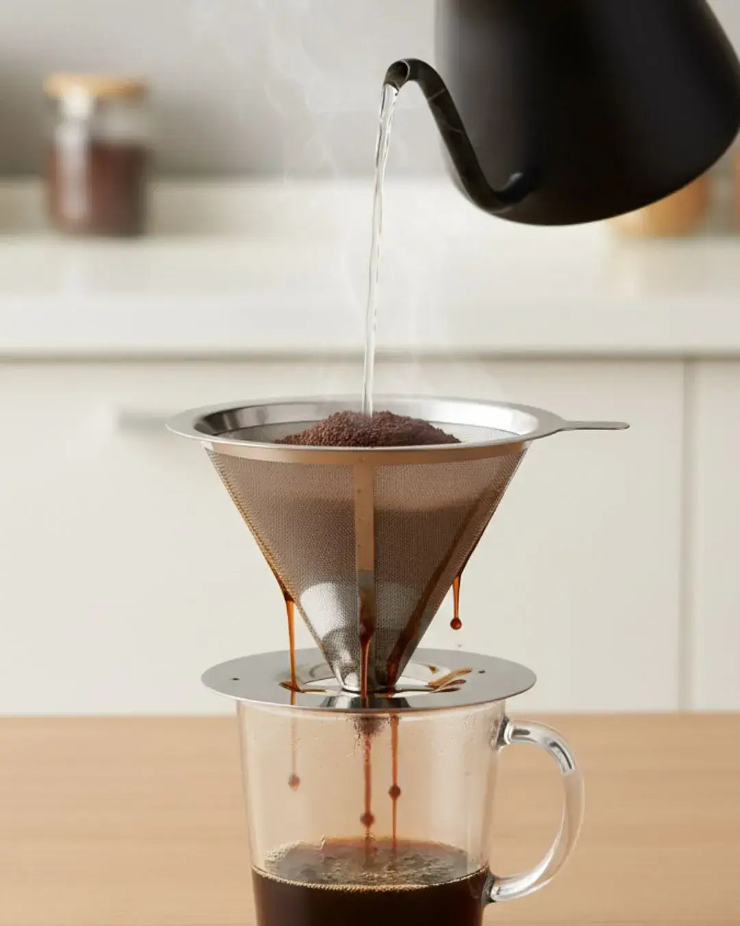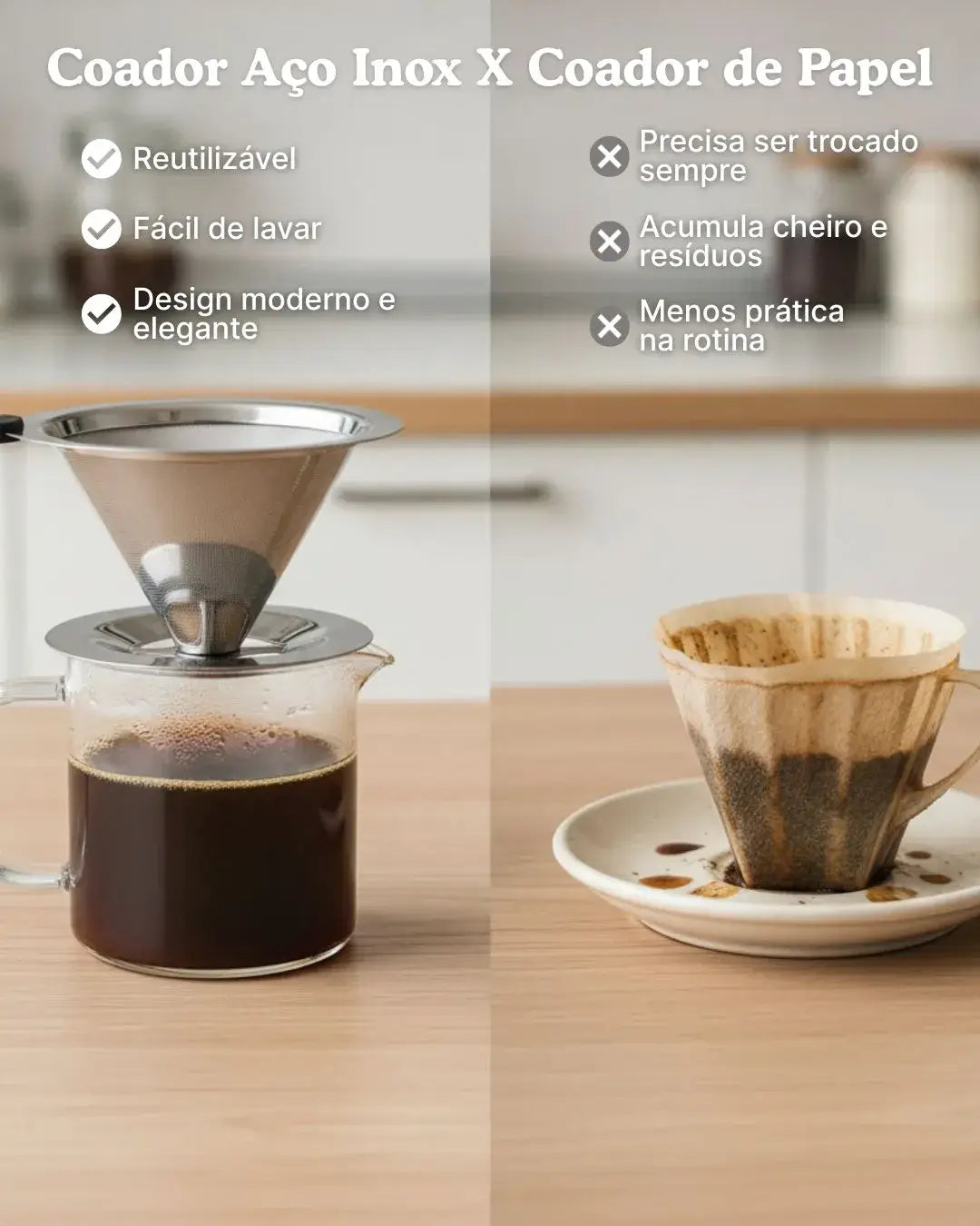 Esqueça os filtros de papel descartáveis. Com o coador de inox, você prepara café todos os dias sem gerar lixo extra.