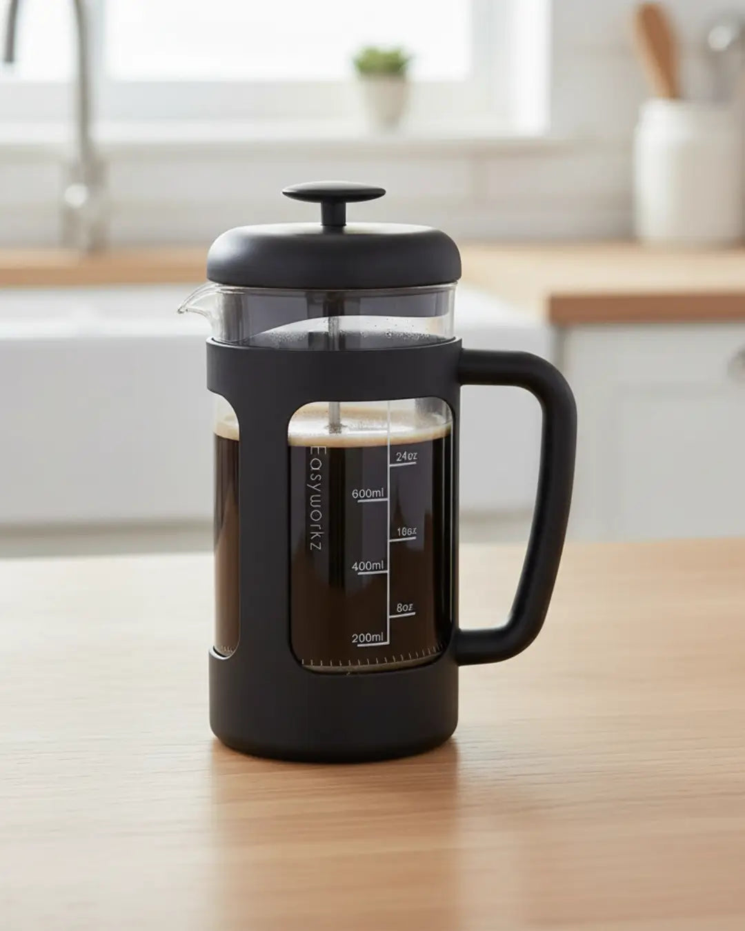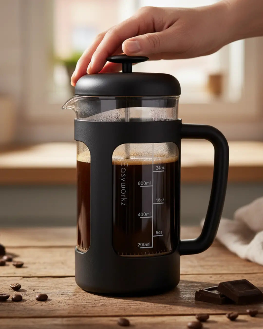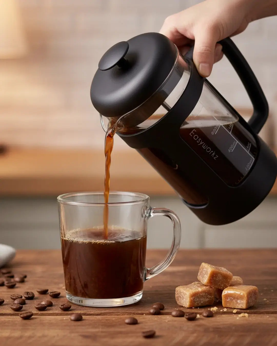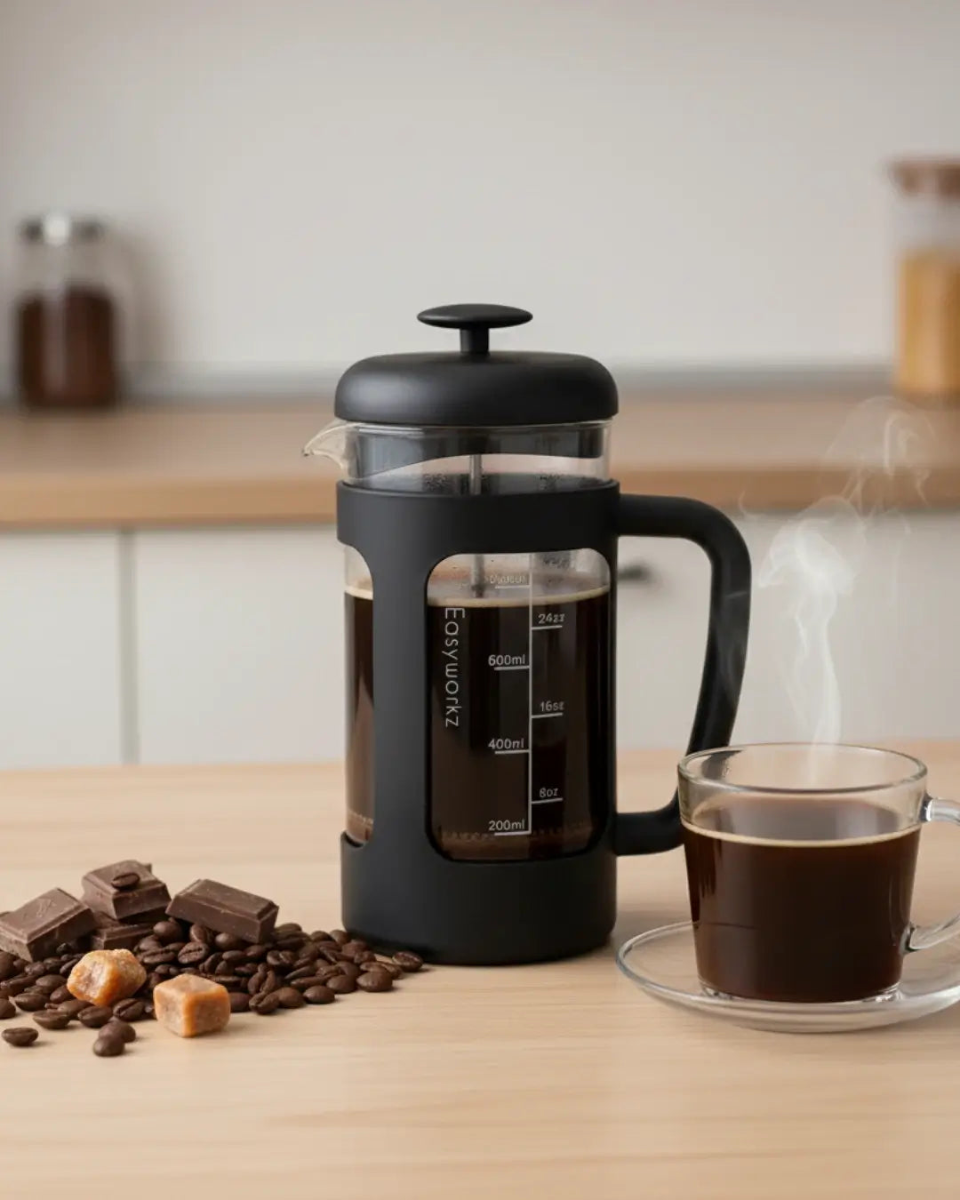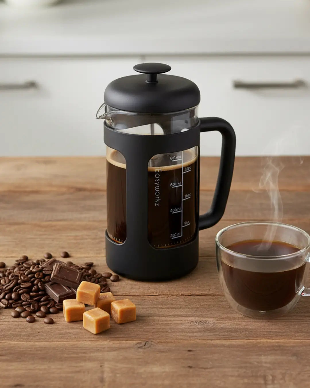 Com a prensa francesa, o café mantém contato total com a água, liberando todo o aroma e notas de chocolate e caramelo.